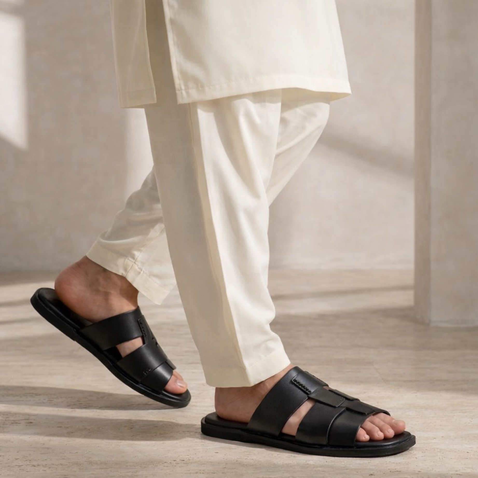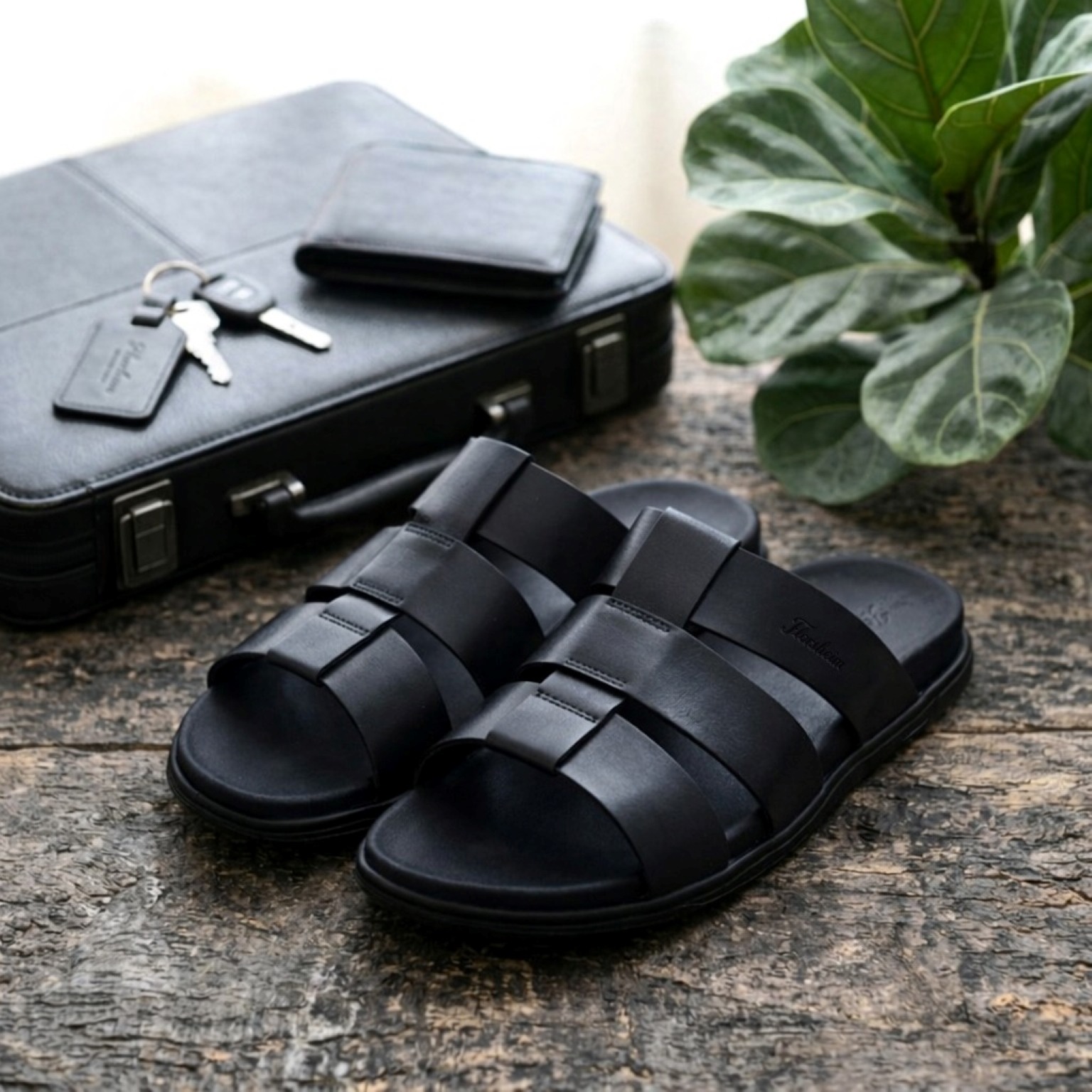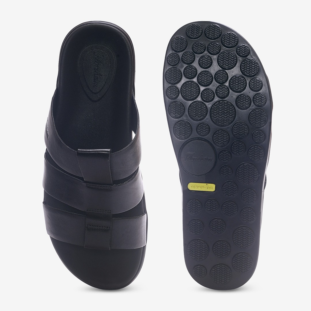 Florsheim Black sandals made from premium plain leather. Minimal design with a refined touch. Comfort-focused straps for easy wear. Flexible EVA sole for smooth movement.